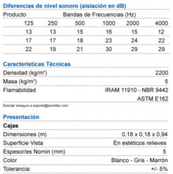 Aislante acústico visto compuesto de una lámina de alta densidad con soporte de espuma de poliuretano que colabora como banda de desacople. Posee un elevado índice de aislamiento sonoro para un amplio rango de frecuencias.