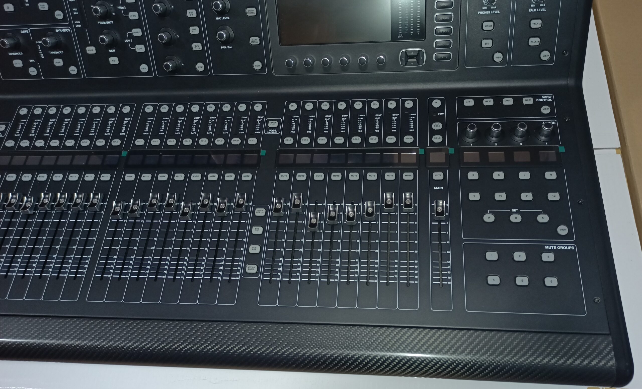 Los codificadores y los interruptores rotatorios iluminados le brindan control de las configuraciones del preamplificador, estanterías de frecuencia, secciones de dinámica dual, así como ecualizador totalmente paramétrico multimodo, envíos de bus y panorama principal, mono y estéreo.