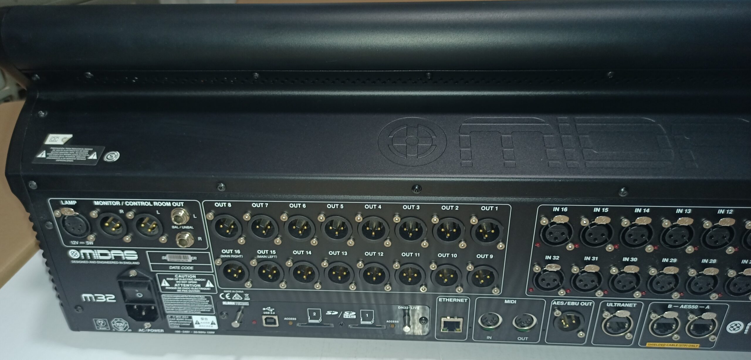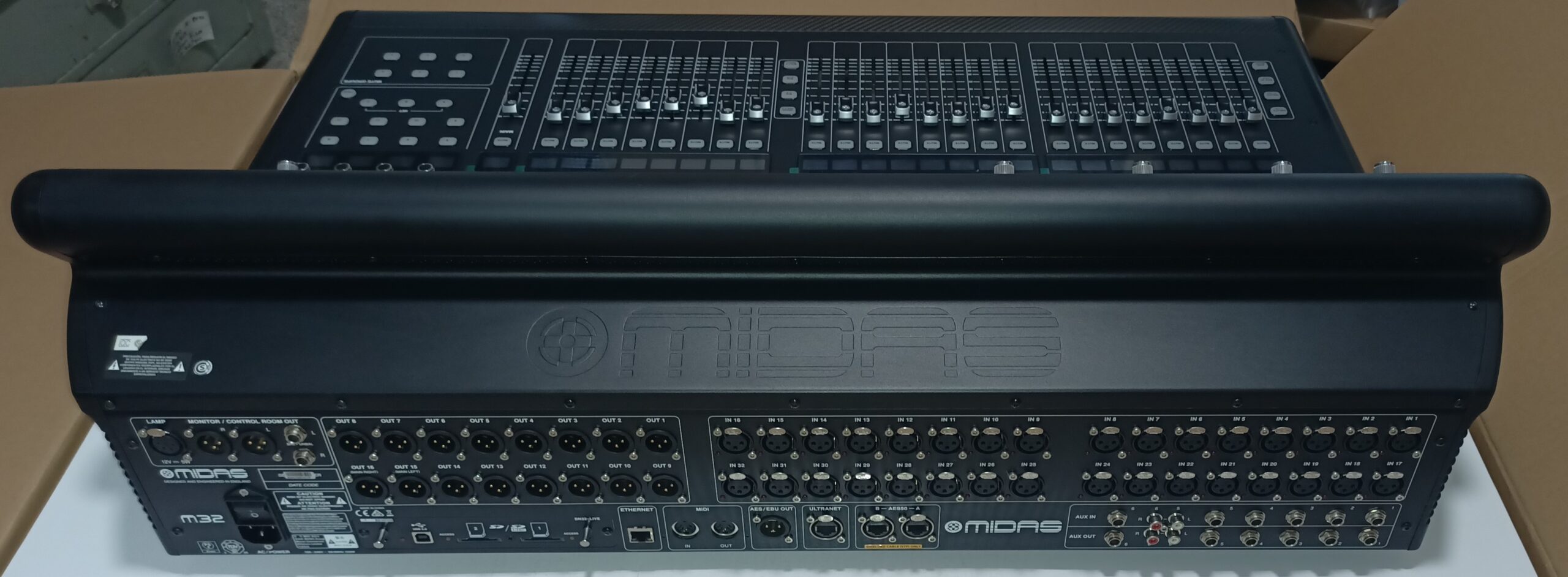 La construcción del Midas M32 LIVE es igualmente impresionante y está diseñada para ofrecer años de rendimiento fiable, soportando las exigentes condiciones de los recintos de conciertos. El M32 LIVE emplea una estructura predominantemente espacial, con partes del subchasis compuestas de fibra de carbono y aluminio, resistentes y ligeras. Se han empleado múltiples aleaciones para garantizar la máxima eficiencia de los componentes y una mejor relación rendimiento-peso.